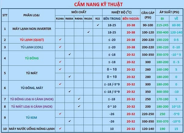 Dưới đây là các bảng thông số kỹ thuật một số thiết bị lạnh cơ bản: